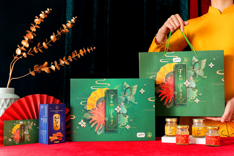 Hiểu được điều này Đông trùng hạ thảo Vietfarm – cơ sở trực thuộc Trung tâm Nghiên cứu và Ứng dụng Thuốc dân tộc, đã cho ra mắt bộ sưu tập quà tặng Tết sức khỏe 2023 với 5 bộ quà tặng Tết cao cấp, sang trọng, thông điệp ý nghĩa. Trong đó, set quà đầu trong bộ sưu tập quà Tết phải kể đến là Tâm Phúc.